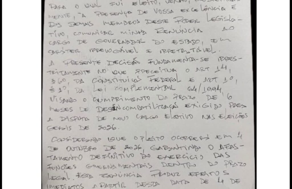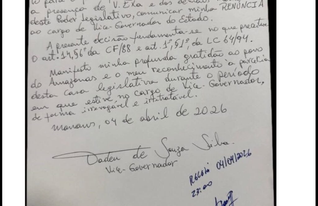Wilson Lima deve concorrer a uma vaga no Senado Federal, enquanto Tadeu de Souza disputará uma cadeira na Câmara dos Deputados. Em suas cartas de renúncia, ambos destacaram o cumprimento do prazo legal de seis meses antes do pleito, marcado para outubro do próximo ano, além de classificarem a decisão como definitiva, em caráter “irrevogável e irretratável”.