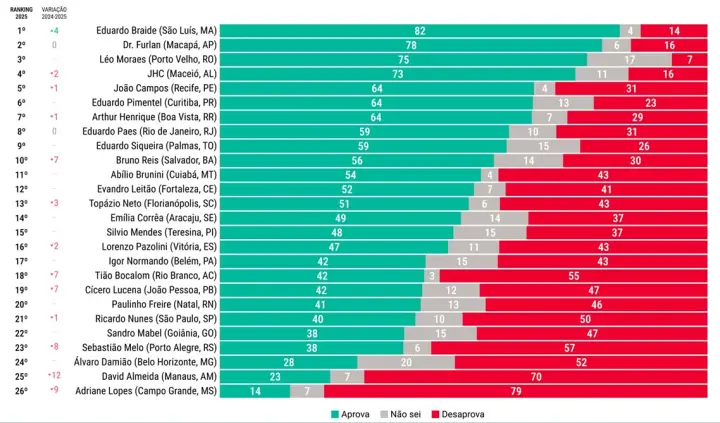Especialistas apontam que a avaliação negativa está associada a críticas recorrentes em áreas como infraestrutura urbana, qualidade dos serviços públicos e condução política da cidade. O desempenho contrasta com o cenário de outros prefeitos de capitais que despontam como possíveis protagonistas em disputas estaduais e nacionais.