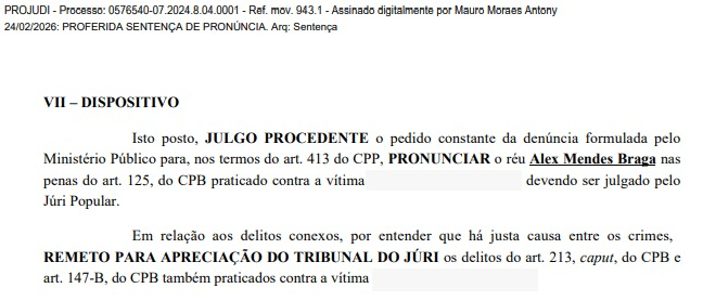 A decisão foi proferida no âmbito do processo 0576540-07.2024.8.04.0001, que tramita em segredo de justiça por meio do sistema eletrônico Projudi. Com isso, o empresário não foi condenado nesta fase, mas será submetido ao crivo do Júri Popular, responsável por julgar crimes dolosos contra a vida. Veja trecho da decisão: