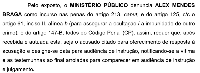 Segundo a sentença, o juiz julgou procedente o pedido do Ministério Público para pronunciar o réu pelo crime previsto no artigo 125 do Código Penal, que trata de aborto provocado por terceiro sem o consentimento da gestante. Também foram remetidos ao Júri os delitos previstos nos artigos 213 e 147-B do Código Penal.