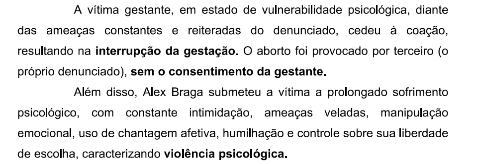 Na denúncia, o promotor afirma que o empresário agiu “com o intuito de ocultar o crime anterior e impedir o nascimento da criança”. O documento descreve que a coação teria ocorrido por meio de manipulação emocional, ameaças veladas e pressão psicológica.