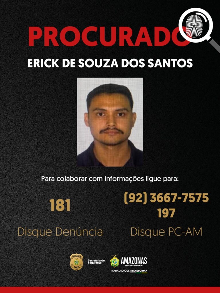 A PC-AM solicita que qualquer informação sobre o paradeiro de Erick de Souza seja comunicada pelos canais: