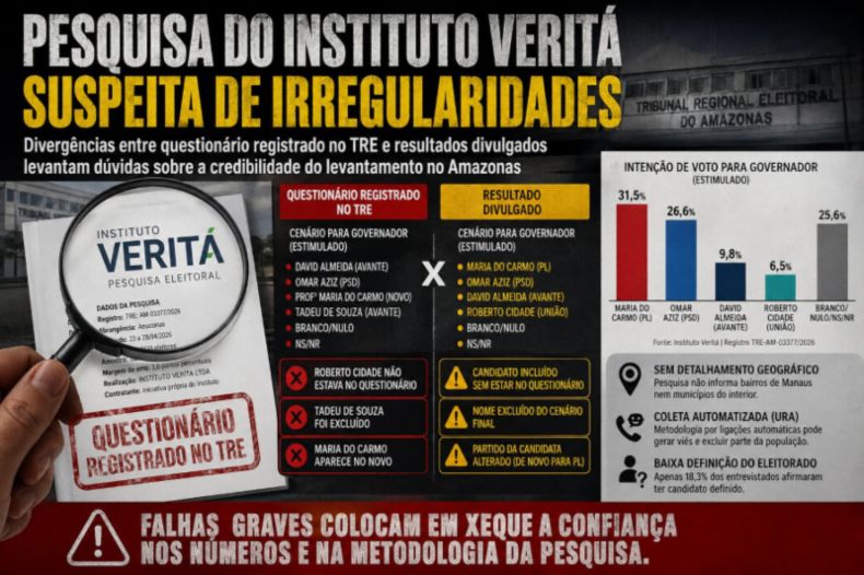 A pesquisa eleitoral com registro TRE: AM-03377/2026, divulgada pelo Instituto Veritá nesta quarta-feira (29), alterou nomes dos candidatos, trocou partidos e não divulgou números e nem a localização dos entrevistados. O estudo deve ser questionado na Justiça Eleitoral.
