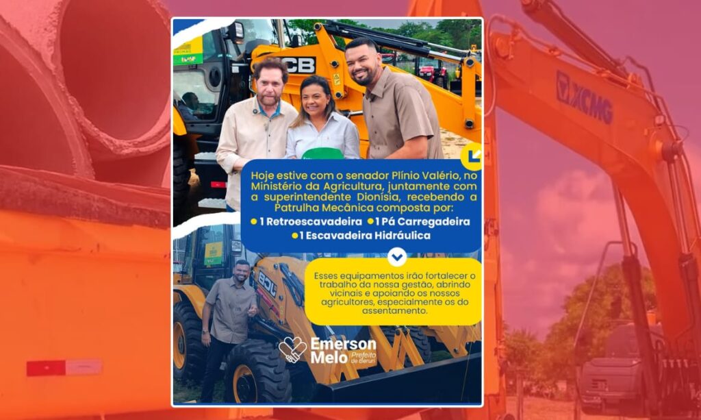 Os maquinários utilizados na obra foram adquiridos por meio de emendas parlamentares do senador Plínio Valério e do deputado federal Sidney Leite, com recursos do Ministério da Agricultura e Pecuária (Mapa), que repassou equipamentos e veículos ao município.